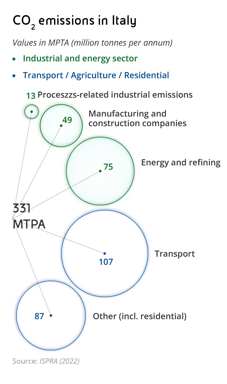 Decarbonization is the term used to describe the gradual reduction in CO2 emissions from human activities that is crucial to combating climate change. This transition requires a profound transformation of our production system, using all the technological innovations at our disposal, from renewable energy sources to advanced biofuels, and from bio jet fuel to blue and green hydrogen . In this scenario, Carbon Capture and Storage (CCS) is the most rapid and efficient solution to immediately reduce the footprint of what we call hard-to-abate sectors. These are industries where, due to their energy-intensive nature and production processes, there are no current solutions to effectively and economically reduce emissions. Sectors such as iron and steel, cement, chemicals, paper and glass fit this description. Not only are their energy requirements such that they cannot be fully powered by renewables, but their core manufacturing processes also release emissions by their very nature, regardless of fossil fuel consumption. In some cases, these process-related emissions form a large part of the total; for example, in cement factories, around two-thirds of CO2 is produced by the calcination of limestone, a key stage in the production of cement. In 2021, Italy's building materials industry reported emissions of approximately 22 million tonnes (Mton) of carbon dioxide. Cumulatively, the hard-to-abate industries have a significant carbon footprint: in Italy alone, in 2021, they were responsible for about 68 Mton of CO2 out of a total of 337 Mton, which represents 20% of total emissions and 42% of the industrial sector alone, which recorded 155 Mton according to the Italian Institute for Environmental Protection and Research (ISPRA, 2023 data). Considering the fact that modern technology allows us to capture more than 90% of the CO2 contained in flue gases, CCS clearly offers a viable way to decarbonize hard-to-abate industries.
