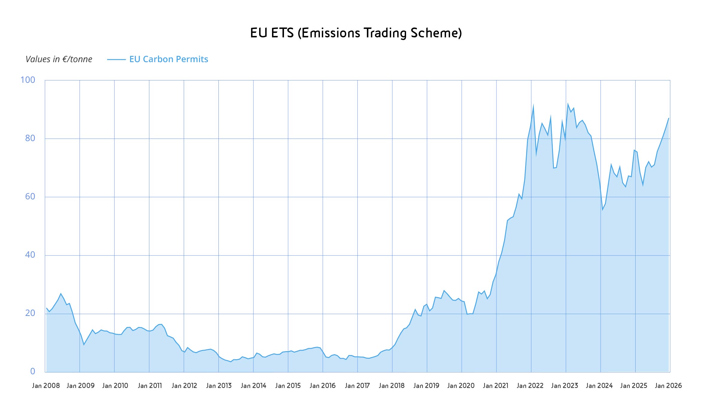 In an effort to encourage the reduction of climate-changing emissions, the European Union approved the European Union Emissions Trading Scheme (EU ETS) in 2009, a tax directly linked to the amount of greenhouse gases emitted by companies. Europe's approach is arguably the most sophisticated, but there are similar schemes either in operation or under consideration around the world. The common goal of such mechanisms is to motivate companies to invest in more sustainable processes or technologies to reduce emissions. However, the vast majority of countries around the world have yet to implement any form of emissions taxation. In terms of the ETS framework, the cost of carbon dioxide emissions has risen from €20 per tonne in 2020 to more than €80 per tonne in 2023. Over the coming decades, this rise will gain momentum as Europe intends to use the ETS system in its commitment to achieve carbon neutrality by 2050.