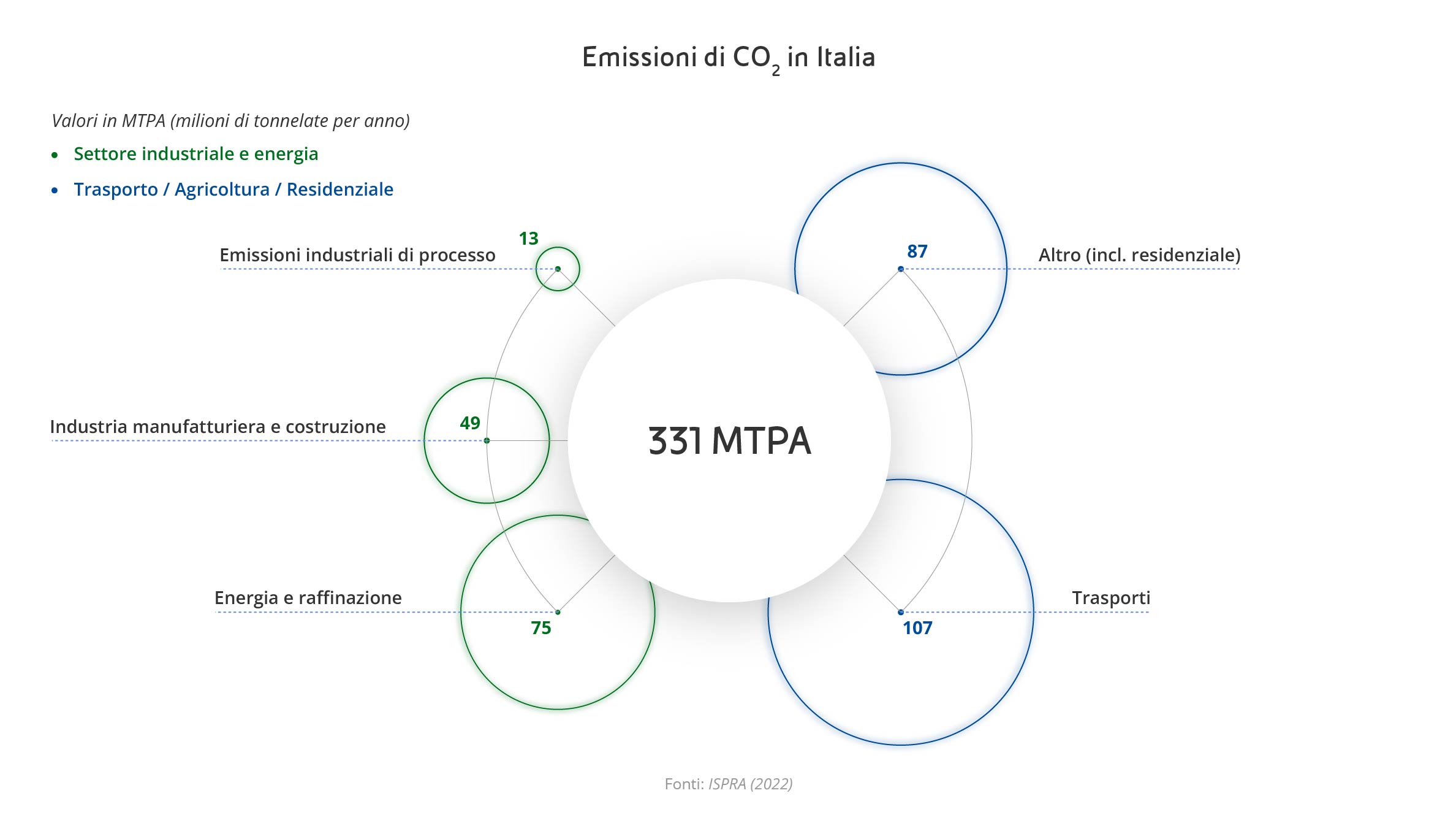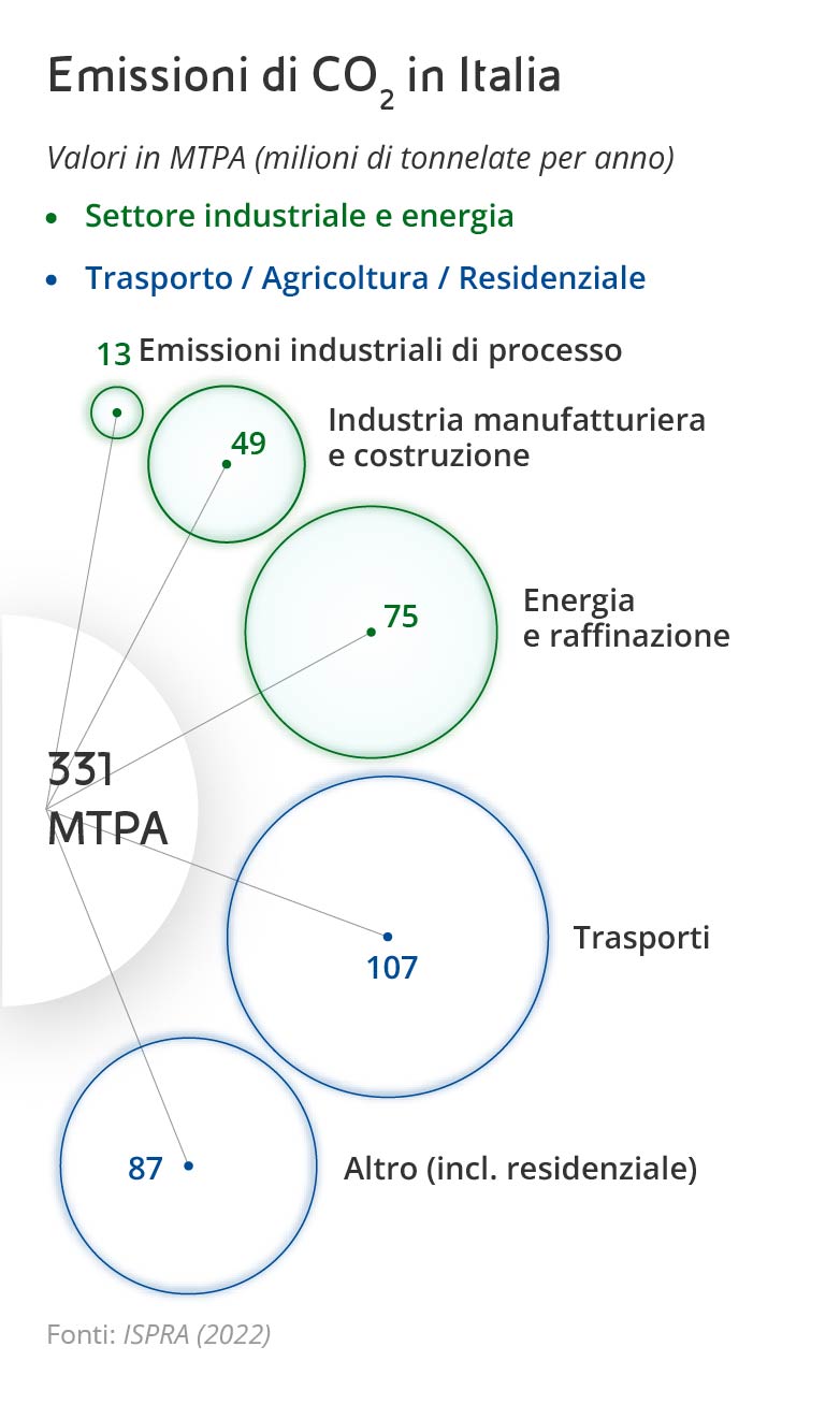 La progressiva riduzione delle emissioni di CO2 delle attività umane, necessaria per contrastare i cambiamenti climatici, prende il nome di decarbonizzazione. Il percorso comporta un’evoluzione profonda del sistema produttivo che necessita di tutti gli strumenti messi a disposizione dall’innovazione tecnologica: dalle rinnovabili ai biocarburanti avanzati, dal bio jet fuel all’ idrogeno blu e verde. In questo contesto, la cattura e stoccaggio della CO2 (CCS) è la soluzione più rapida ed efficace per ridurre da subito l’impatto di settori particolari detti “hard to abate” e cioè quelle attività industriali per cui, sia per gli alti consumi di energia sia per i processi produttivi, allo stato attuale, non esistono tecnologie per abbattere le emissioni in modo efficiente ed economicamente sostenibile. Esempi di industrie hard to abate sono gli impianti siderurgici e i cementifici, ma anche l’industria chimica, della carta e del vetro. Oltre a non poter essere alimentate esclusivamente da fonti rinnovabili a causa dei loro intensi consumi, queste attività comportano anche emissioni dovute ai loro stessi processi produttivi, indipendentemente dall’uso di combustibili fossili. In alcuni casi le emissioni di processo sono una parte rilevante di quelle totali: nei cementifici, ad esempio, circa due terzi della CO2 deriva dalla calcinazione del calcare, passaggio imprescindibile per la produzione del cemento. In Italia, nel 2021, il settore dei materiali per edilizia ha dichiarato emissioni per circa 22 Mton di anidride carbonica. Nel loro insieme, le attività hard to abate concorrono in maniera significativa alle emissioni complessive di anidride carbonica: solo in Italia, nel 2021 hanno emesso circa 68 milioni di tonnellate (Mton) di CO2 su un complessivo nazionale di 337 Mton, ovvero il 20% del totale e il 42% del solo settore industriale, responsabile dell’emissione di 155 Mton di CO2 secondo lIstituto Superiore per la Protezione e la ricerca Ambientale (ISPRA, dato 2023). Considerando che le moderne tecnologie permettono di catturare oltre il 90% dell’anidride carbonica emessa al camino, la CCS si presenta come la soluzione concreta per la decarbonizzazione delle industrie hard to abate.